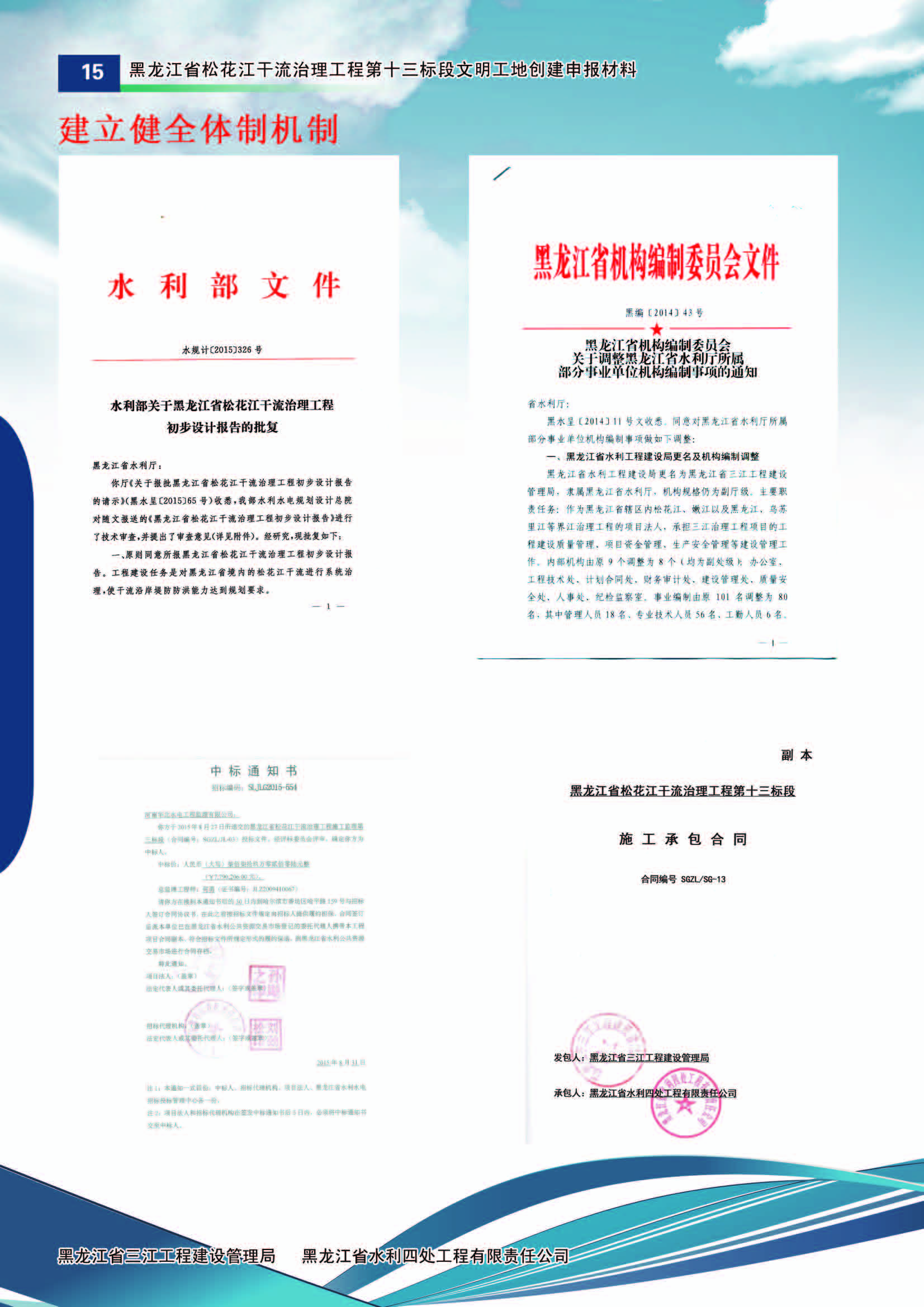 2015年8月22日,經(jīng)過(guò)公開評(píng)標(biāo),松花江干流治理工程第十三標(biāo)段確定施工中標(biāo)單位為黑龍江省水利四處工程有限責(zé)任公司,合同金額為1.23億元,合同工期489日歷天。
